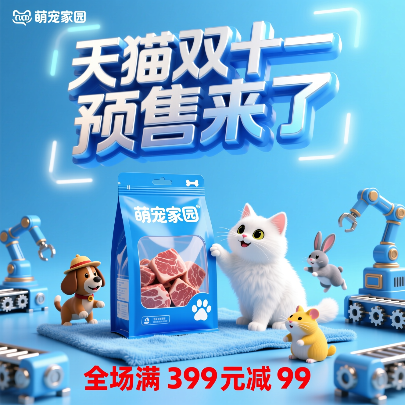 一张4D风格的电商促销海报,画面以蓝色为主色调,整体呈现出清新、活泼的氛围。海报上方有巨大的 “天猫 双十一 预售来了” 立体文字,视觉冲击力强。中间是一袋蓝色的宠物食品,包装上有透明窗口展示内部的肉块,包装显示品牌名字“宠物家园”,旁边有一只可爱的小狗。周围还有一些小型的动物模型和蓝色的机械设备,营造出一种热闹的促销场景。底部有红色的 “全场满 299 元减 69” 字样,突出了促销信息。 |