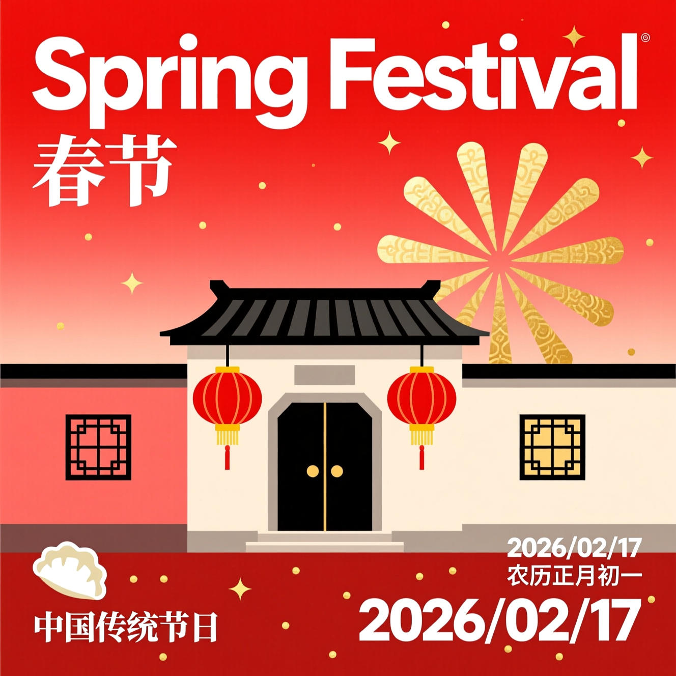 扁平几何插画风格,一张春节海报,杂志封面,色调与背景:以红色渐变为主色调,营造出柔和且富有节日氛围的背景,奠定温馨且传统的基调。 文字元素:白色字体搭配阴影效果,主文案突出"春节"分两行不分开,正文信息下方"2026/02/17"、"农历正月初一"。 主体图案: 一个中式宅院挂着红色灯笼,高饱和色调,周围点缀祥云元素,增添节日活力。 细节点缀:添加 "中国传统节日" 字样,搭配小型饺子图标,丰富文化细节。高级简约排版方式,大师杰出作品。简约,时尚,大气,新中式传统海报,字体不要有阴影样式。 |